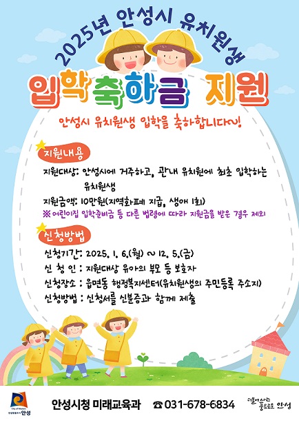안성시는 2025년 유원생 입학축하금을 지원한다. 안성시에서 성장하고 있는 유아의 유치원 입학을 축하하고 학부모의 양육비 부담을 경감하여 교육복지를 보편화하고 안성시의 행복한 교육환경을 실현하기 위함이다.